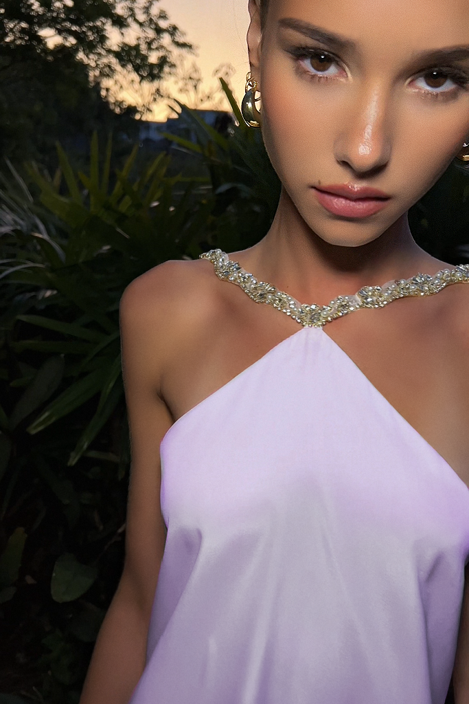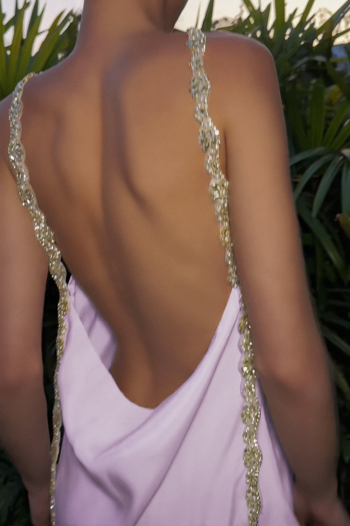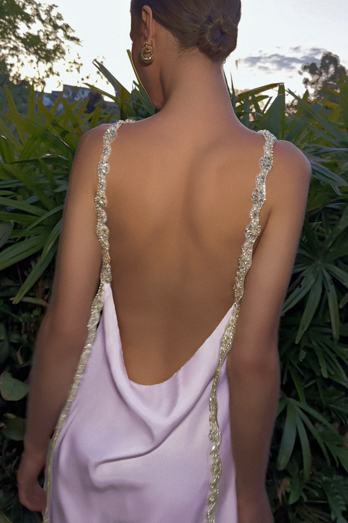 The soft to touch matte 100% pure silk is soft and shimmering. Styled into a plunging super sexy back.